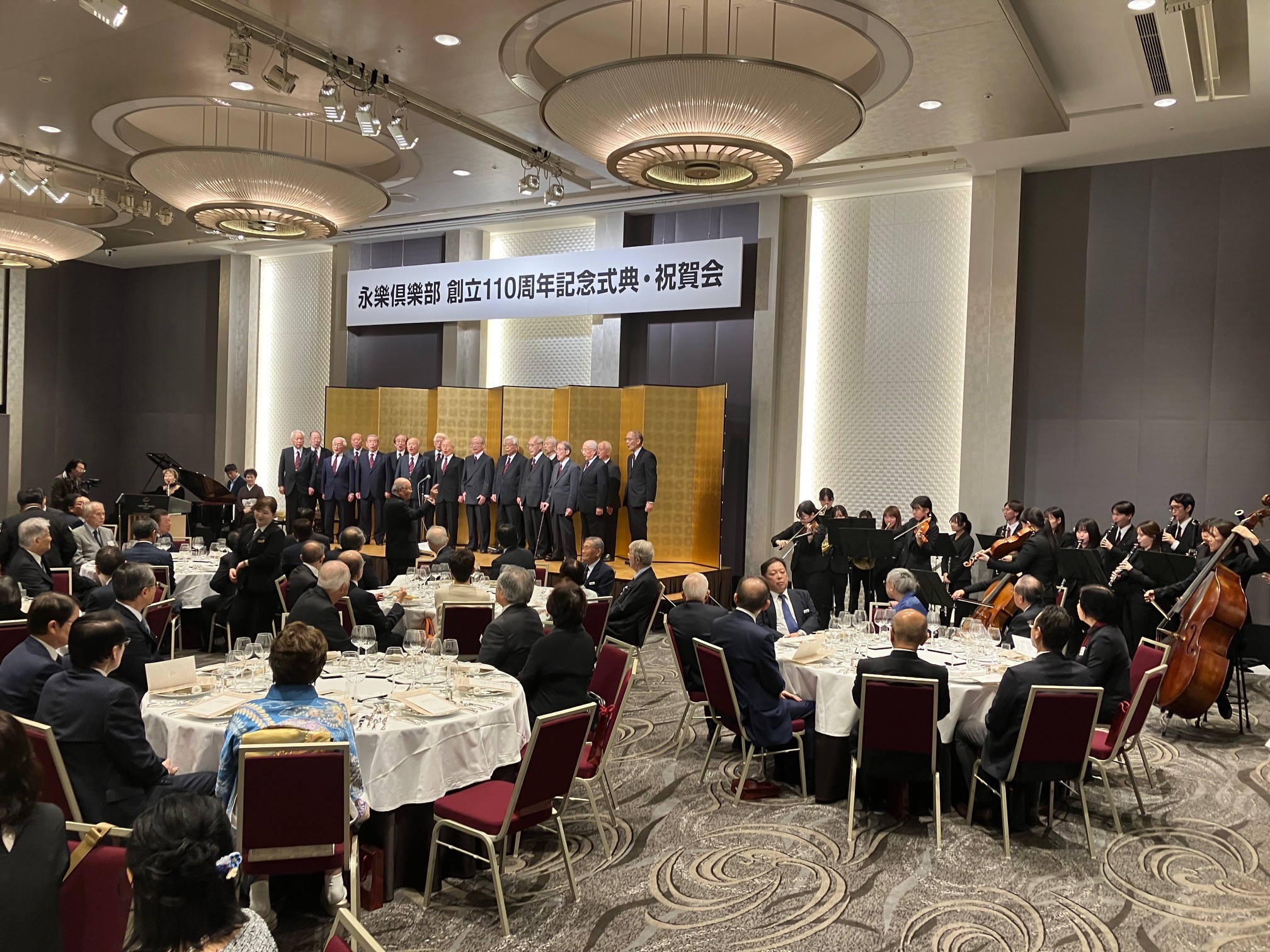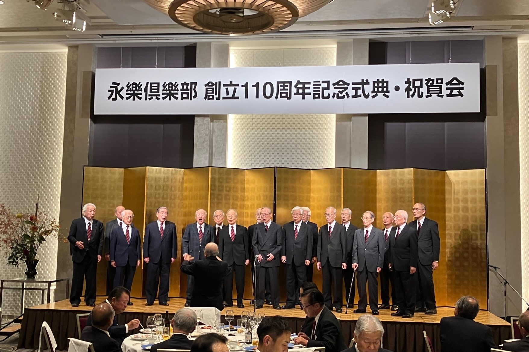 昭和40年代前半に卒業したワセグリOBで構成する倶楽部グリーは10月22日、東京・永田町のザ・キャピトルホテル東急で開かれた「永楽倶楽部創立110周年記念式典・祝賀会」に出演し、衰えぬ若々しい歌声を披露しました。
