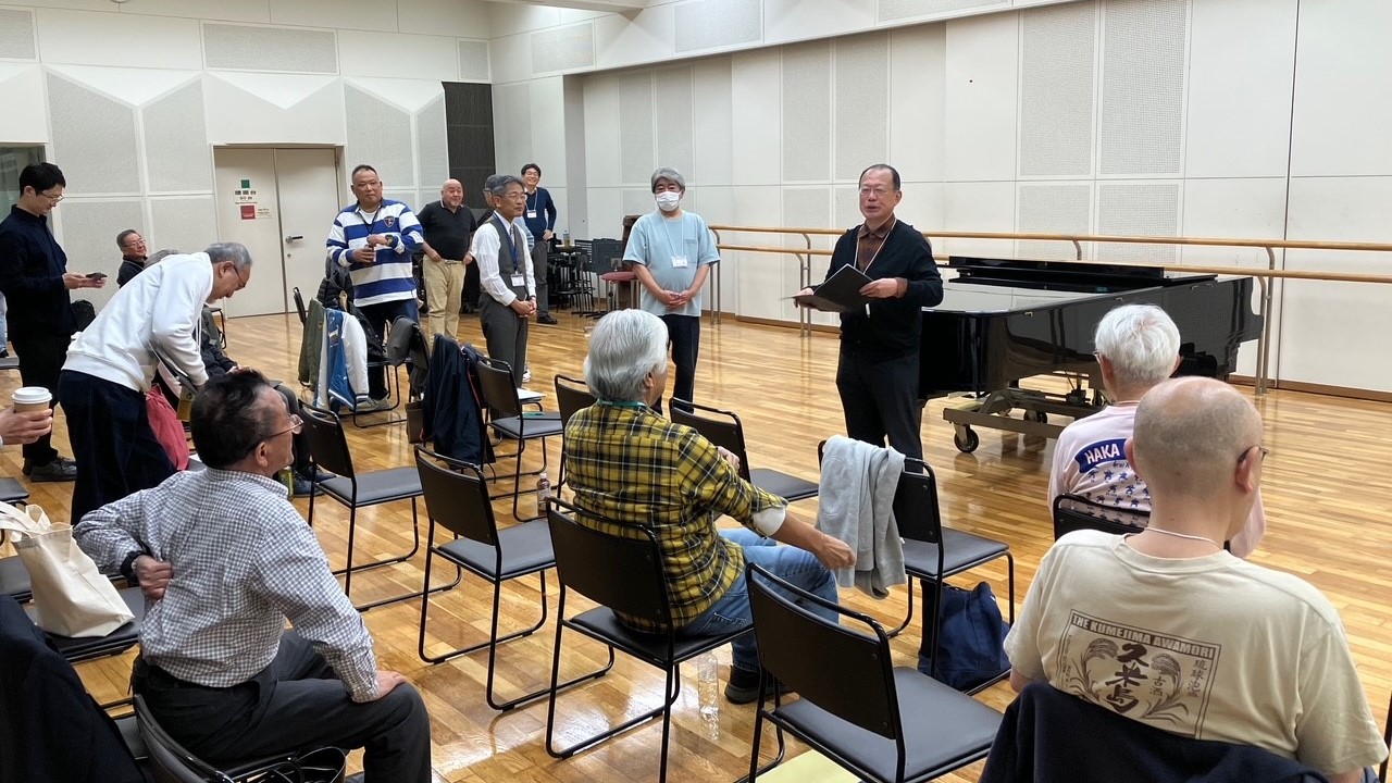 11月8日、ワセグリOBの第1回練習が東京芸術劇場リハーサル室で行われ、約40人が参加しました。コンサートの早稲田の実行委員長、笹原優樹さん(S59卒)が「2カ月間の時限合唱団ですが、偉大な福永先生の下に集まった皆さんが明るく楽しく真剣に高度な音楽をつくって、より仲良くなっていただけたらうれしい」とあいさつしました。