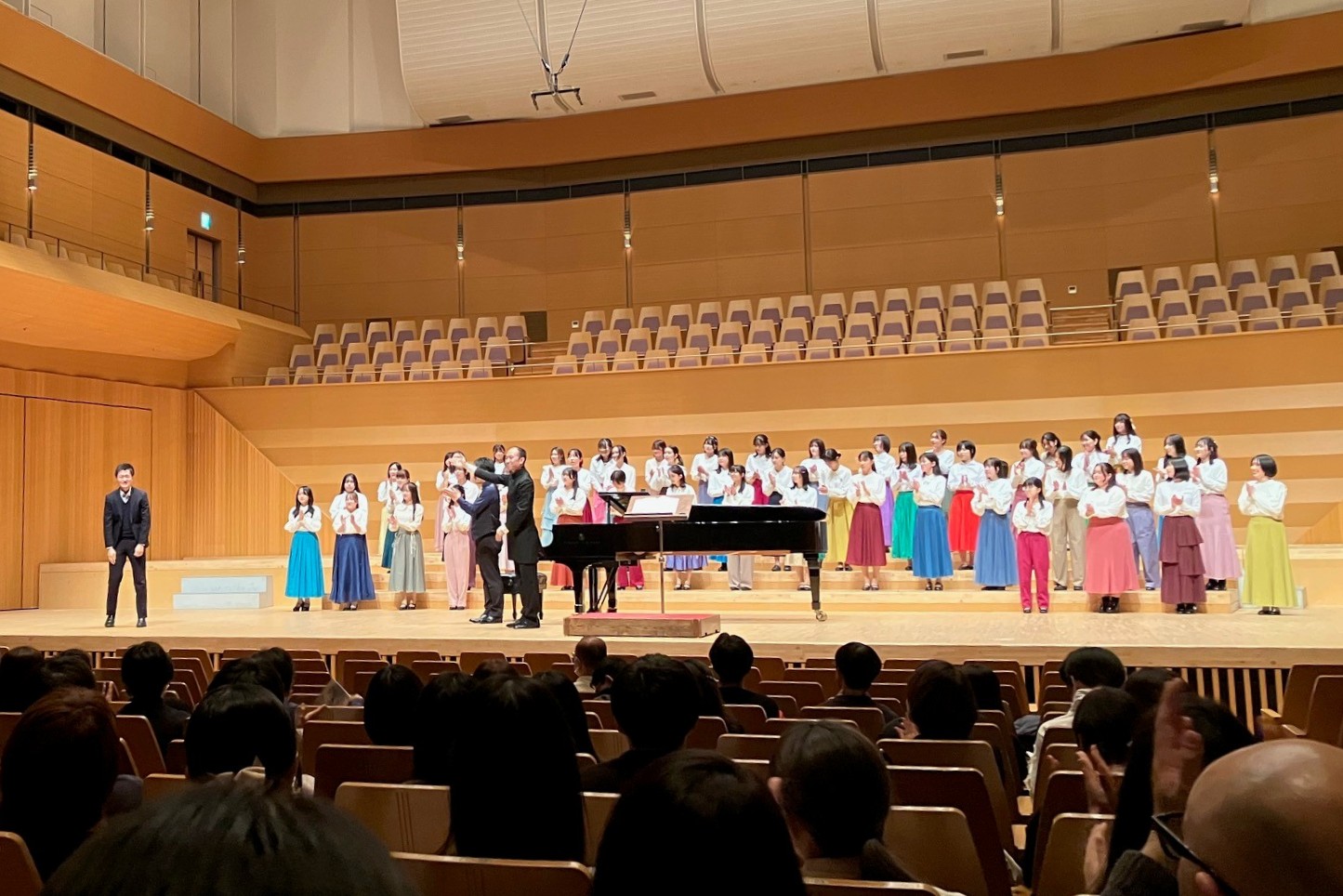 アンコールは山脇さんの指揮で、根岸氏が谷川俊太郎の詩から作曲した「ありがとう」を委嘱初演。岡田さんの指揮で「Hail Holy Queen」を歌って、大きな拍手に包まれながら終演しました。
