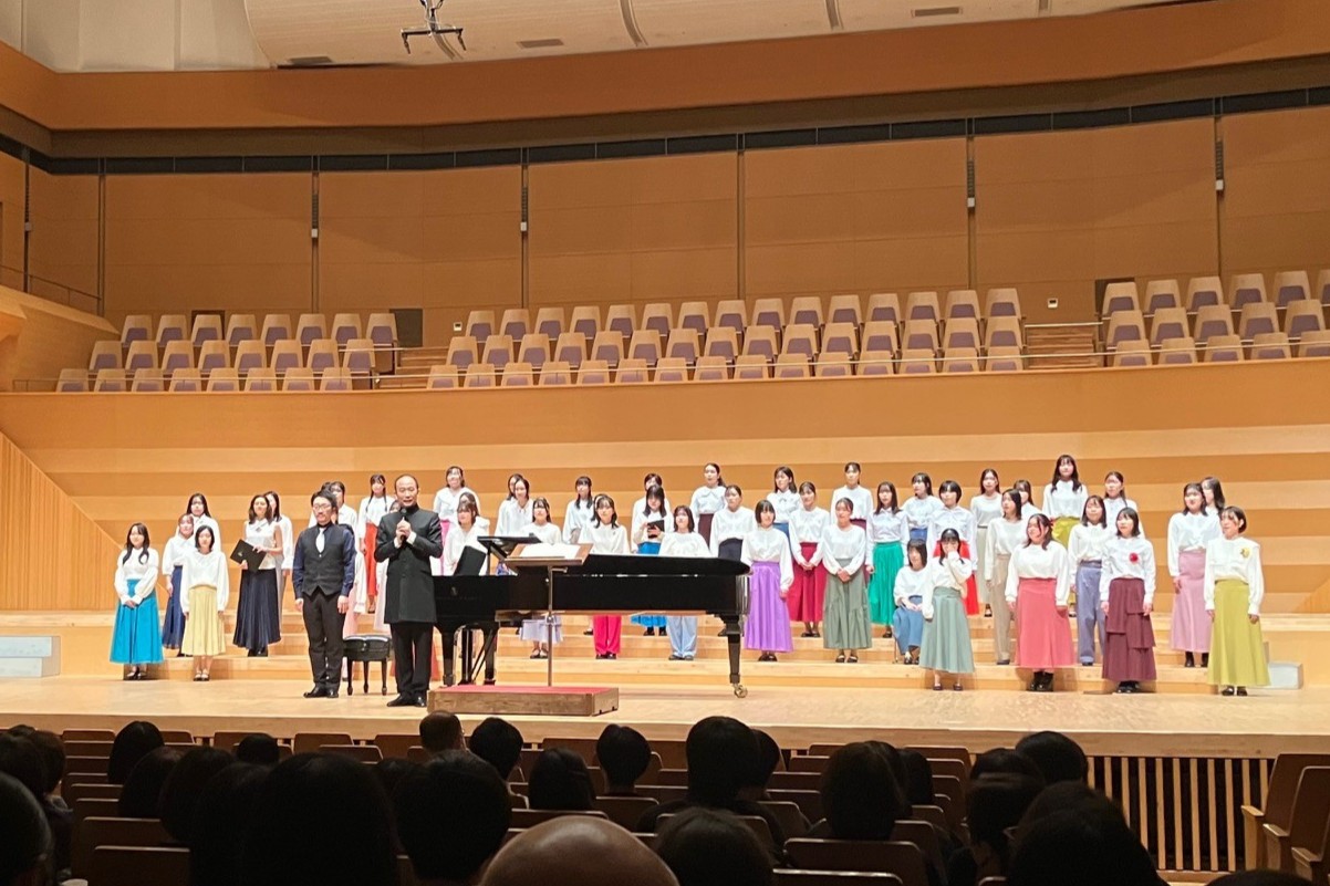 続いて、委嘱作品「あなたと歩く」(たかはしけいこ作詩、根岸宏輔作曲)を初演し、大きな拍手を受けました。休憩をはさんで、学生指揮者の岡田ひかるさん(3年)がサンタクロースの衣装で指揮し、メンバーがカチューシャを付けて歌った「クリスマスアラカルト」も聴衆を楽しませました。