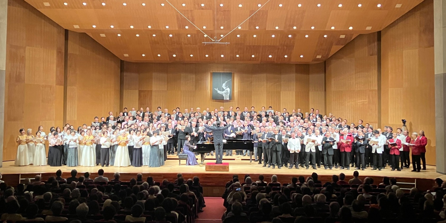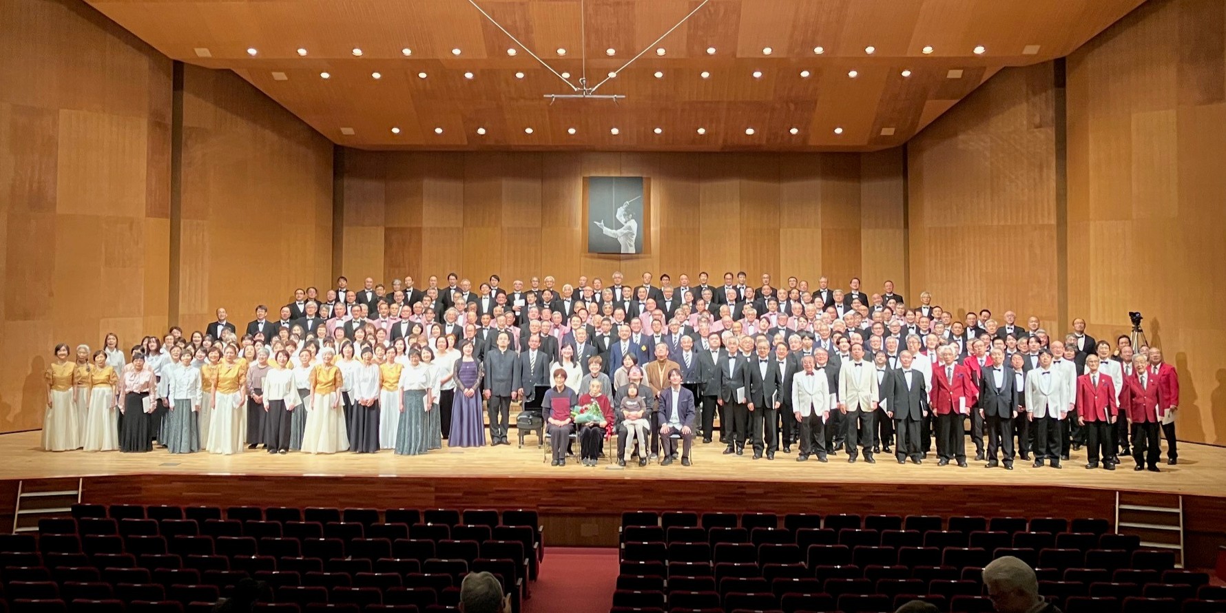 最後の合同演奏は総勢約260人で、ヴェルディ歌劇《ナブッコ》より「行け、我が想いよ、黄金の翼に乗って」、シベリウス「フィンランディア讃歌」(安田二郎作詞)を、吉川貴洋氏(藤沢男声合唱団)の指揮、黒澤美雪氏のピアノで歌いました。