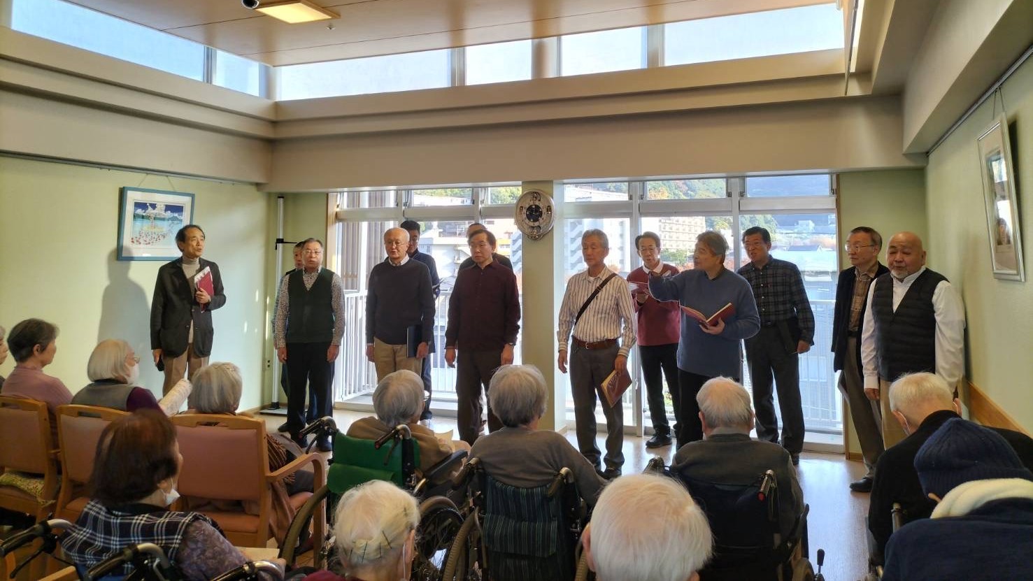 入所者と施設の職員の方々合わせて30名程度の聴衆でしたが、みんなで歌おうコーナーでは一緒に歌っていただいたり、私たちのコーラスを聴いている時には無表情だった入所者の方が何かを思い出したように楽しそうに声を出されたりするのを拝見して、開催してよかったなと思いました。